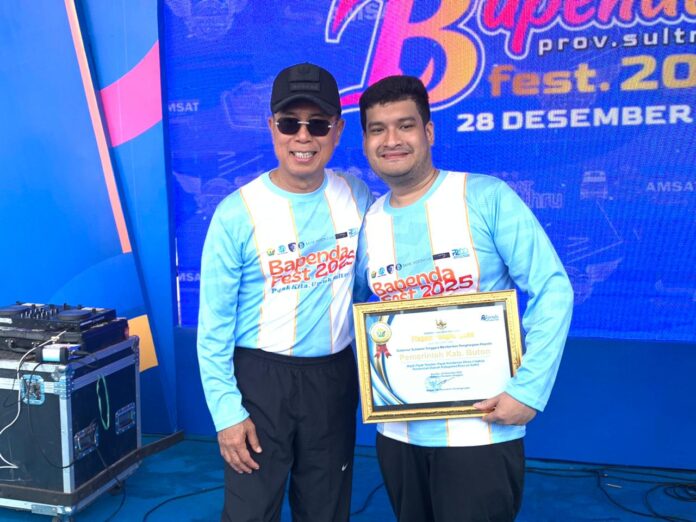 HELIONEWS, Kendari – Bupati Buton, Alvin Akawijaya Putra meraih penghargaan Wajib Pajak Teladan dalam kategori Pajak Kendaraan Dinas Lingkup Pemerintah Daerah Kabupaten/Kota se-Sulawesi Tenggara. Penghargaan tersebut diserahkan langsung oleh Gubernur Sulawesi Tenggara, Andi Sumangerukka, pada kegiatan Bapenda Fest Sultra yang dipusatkan di Pelataran Eks MTQ, Kota Kendari, Minggu, (28/12/2025).